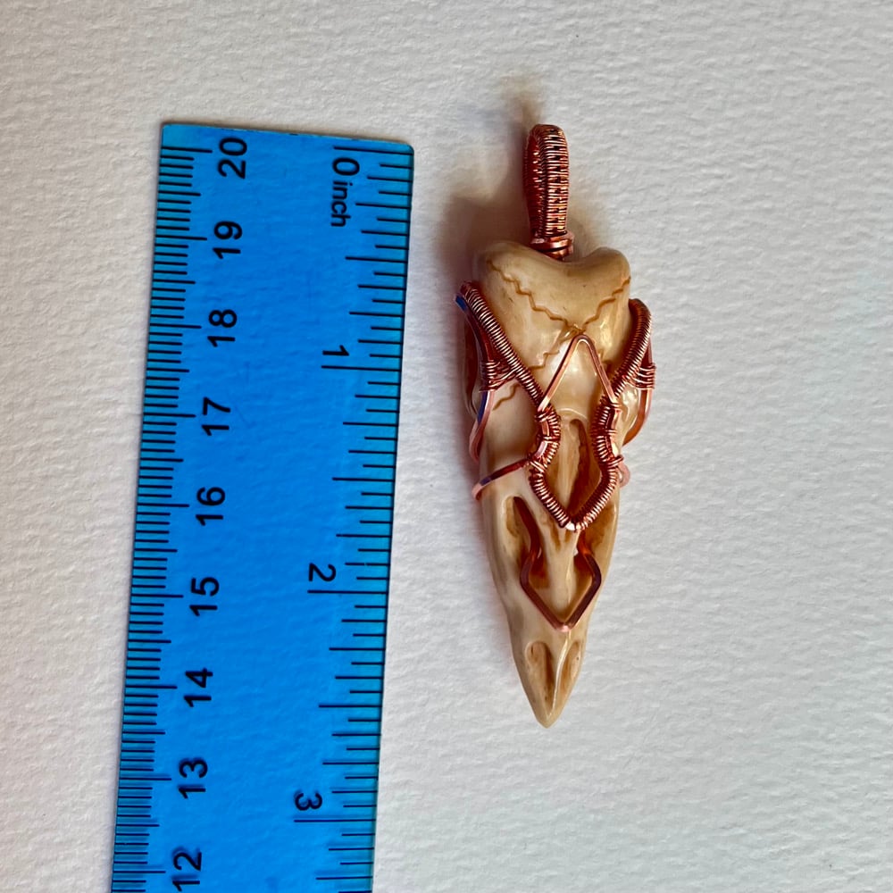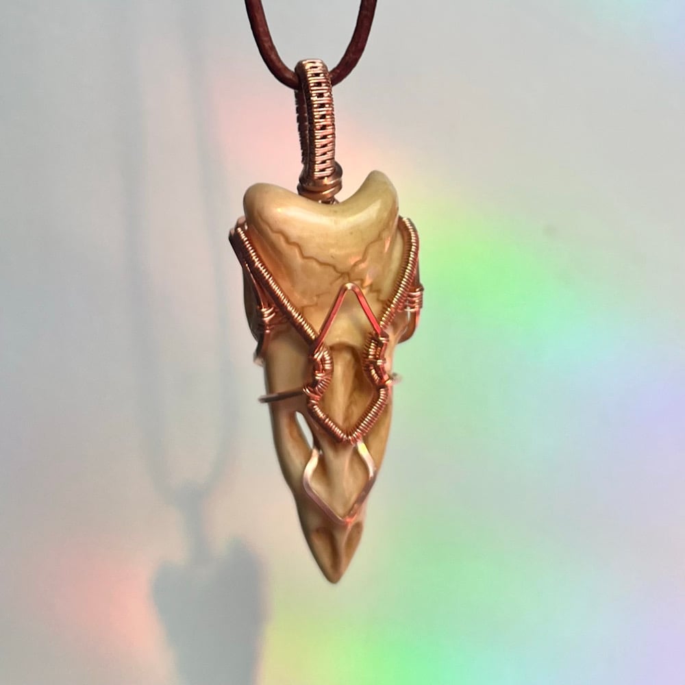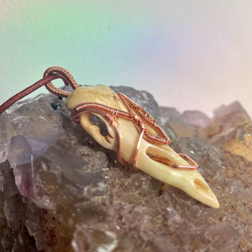 Hand-carved from ethically sourced water buffalo bone and woven in bare copper, this pendant embodies primal resilience and the balance between life and decay. Copper’s warmth awakens the bone’s ancient memory, amplifying grounding and courage, while the skeletal form stands as a reminder of endings that give rise to beginnings.