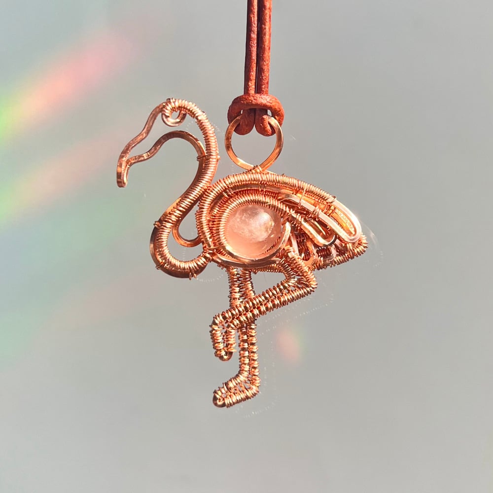 Copper curves into the graceful stance of a flamingo, holding a luminous lattice sunstone at its heart. Sunstone, alive with fiery inclusions, radiates joy, vitality, and leadership. The flamingo, master of balance and poise, carries this light with elegance, a reminder to stand tall, shine boldly, and keep harmony in your stride.
